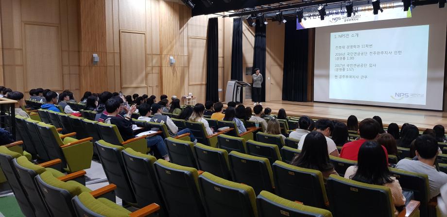 - 일시/장소 : 5.2(목) 14:30/인문학관 1층 강당 - 참석자 : 사회복지학과 재학생 등 81명 - 주최 : 국민연금 공주부여지사 - 내용 : 국민연금제도 소개 및 신규 입사직원의 취업 성공 노하우(입사지원 사전 준비사항 등)